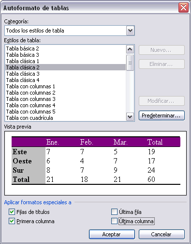 - Autoformato. Mediante este botón podemos elegir entre varios formatos ya establecidos, como, por ejemplo,Tabla clásica 2 que es el que se ve en la imagen. Word aplicará las características del formato elegido a nuestra tabla.